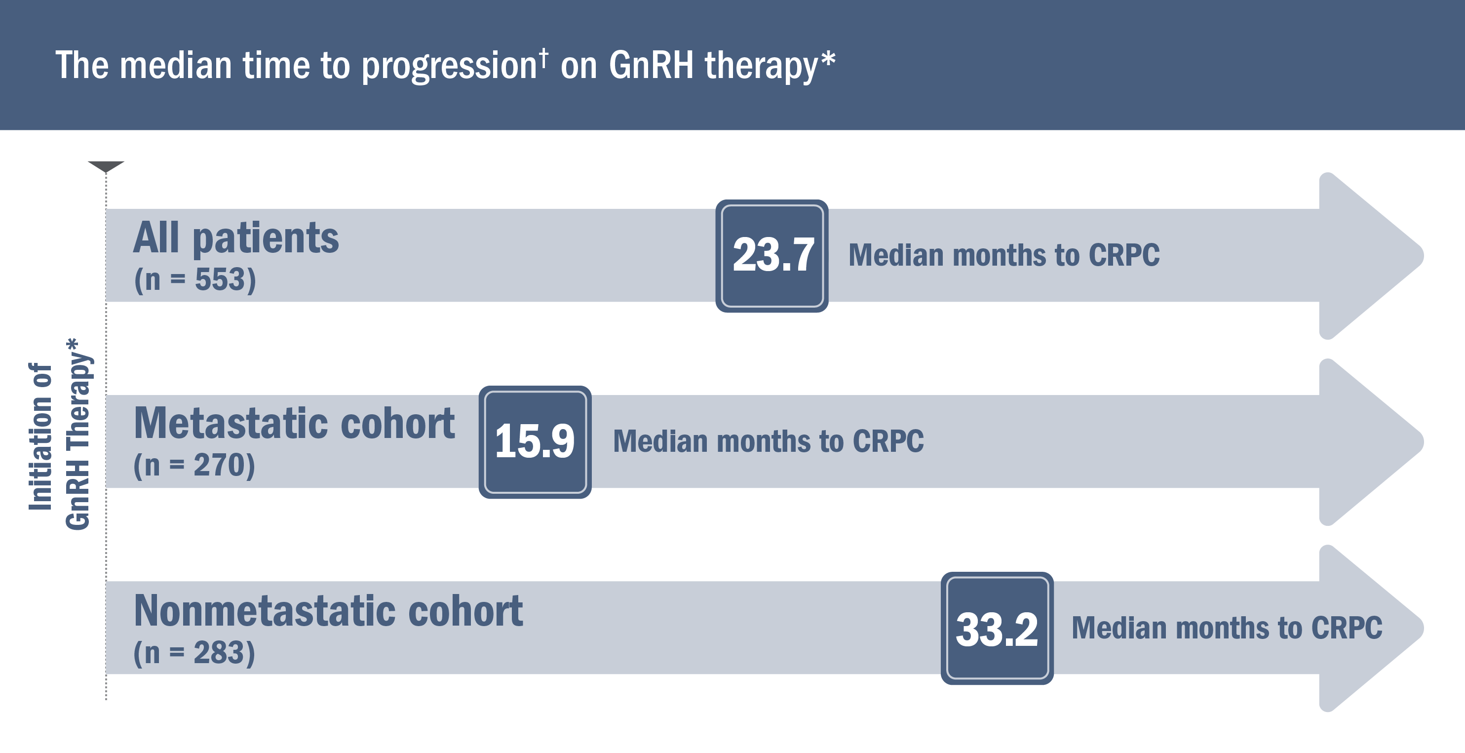 The median time to progression† on GnRH therapy* (also known as androgen deprivation therapy) was assessed in a retrospective analysis of 553 patients initiating GnRH therapy* (+/- anti-androgen) with metastatic (49%) or nonmetastatic (51%) castration-sensitive prostate cancer. Median follow-up was 5.1 years2