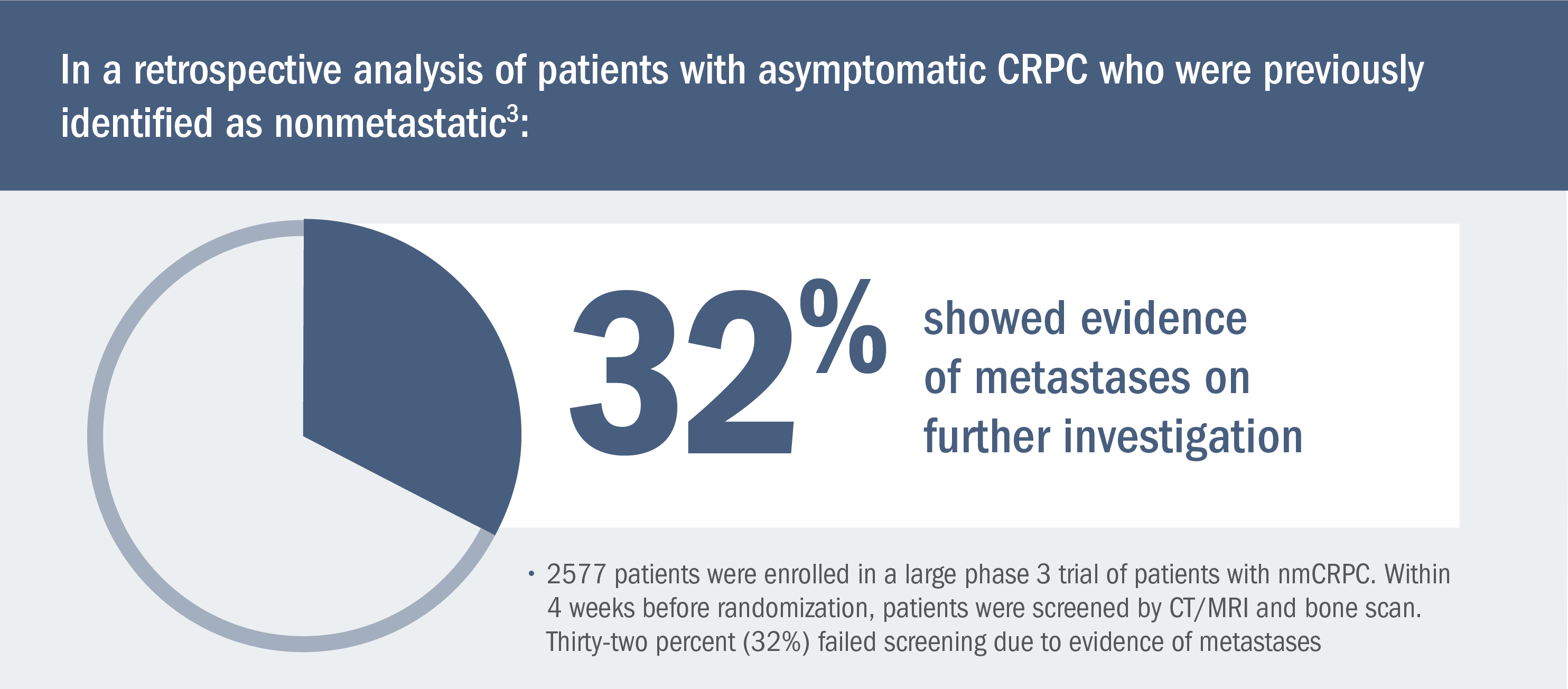 - From a retrospective analysis of 561 patients with confirmed bone metastases from a randomized phase 3 trial, bone metastases at trial entry were confirmed by bone scintigraphy supplemented by CT and/or MRI (where metastases were equivocal). The trial ended early due to a lack of efficacy, which allowed the authors to combine both cohorts and correlate the number of bone metastases present at baseline with the natural history of mCRPC4