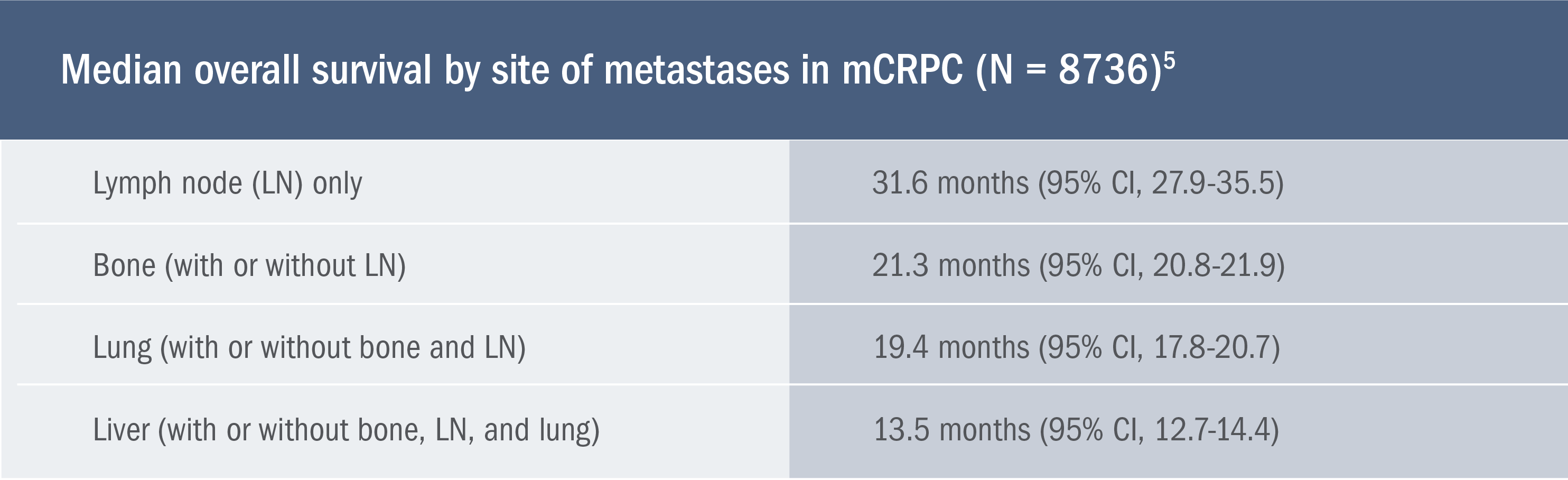 This meta-analysis of nine phase 3 studies included 8736 men with CRPC who received docetaxel chemotherapy and was used to evaluate the impact of site of metastases on overall survival5