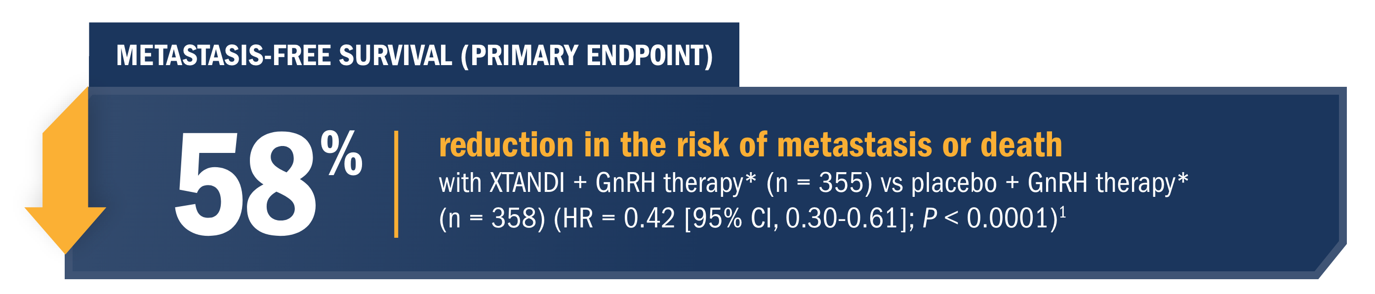 • Number of events: 154 (26.8%) with XTANDI + GnRH therapy* vs 202 (35.1%) with placebo + GnRH therapy*1